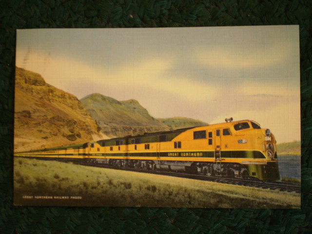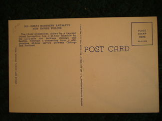 This is a neat OLD colored postcard of the Great Northern Railways New Empire Builder...late 40's maybe? It is new...never used and in great condition. It was published by Keenan News Agency, Spokane, Wa. It reads: The 12-car streamliner, drawn by a 2-unit diesel locomotive, has a 45-hr schedule for the 2,211 mile run between Chicago and Seattle. Oh my...memories! Price $ 5.00.